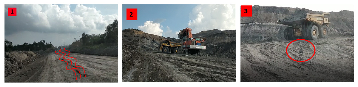 大部分道路状况良好,地面干净,没有碎石。不过在采矿点附近,有一些尖锐的碎石,需要尽快清理干净,以免造成轮胎切割。有段运输道路起起伏伏,对轮胎胎侧产生冲击,轮胎容易受力不均,产生故障,影响轮胎使用寿命。技术工程师建议矿方尽快修整路面,减少道路起伏。