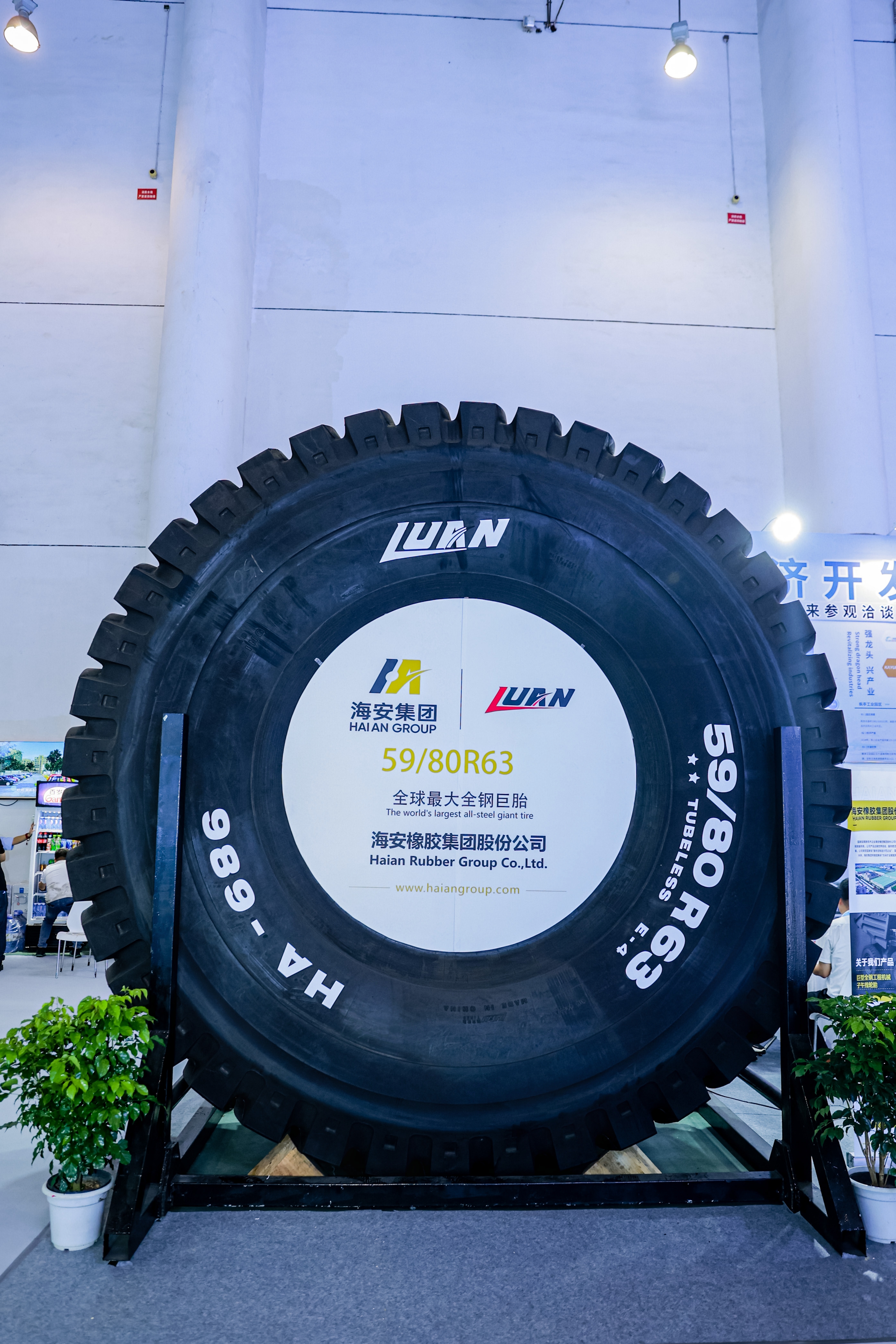 展会现场,海安集团重点展示了其自主研发生产的59/80R63巨型工程轮胎,该产品是目前全球范围内最大规格的全钢巨胎,用于超大型矿用自卸车的核心配件,具备极高负荷能力、卓越抗切割性能和超长使用寿命。它的成功研发,突破了多项国际垄断,填补了国内超大型工程轮胎领域的空白,成为中国高端装备制造领域自主创新的重要里程碑。